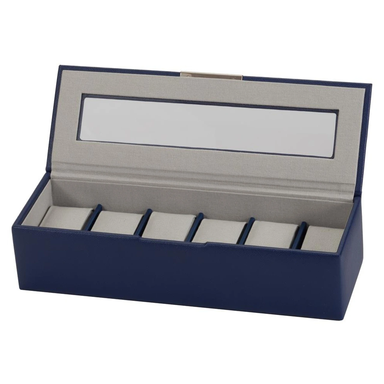 - 6 watch box completely lined with light grey fabric interior.