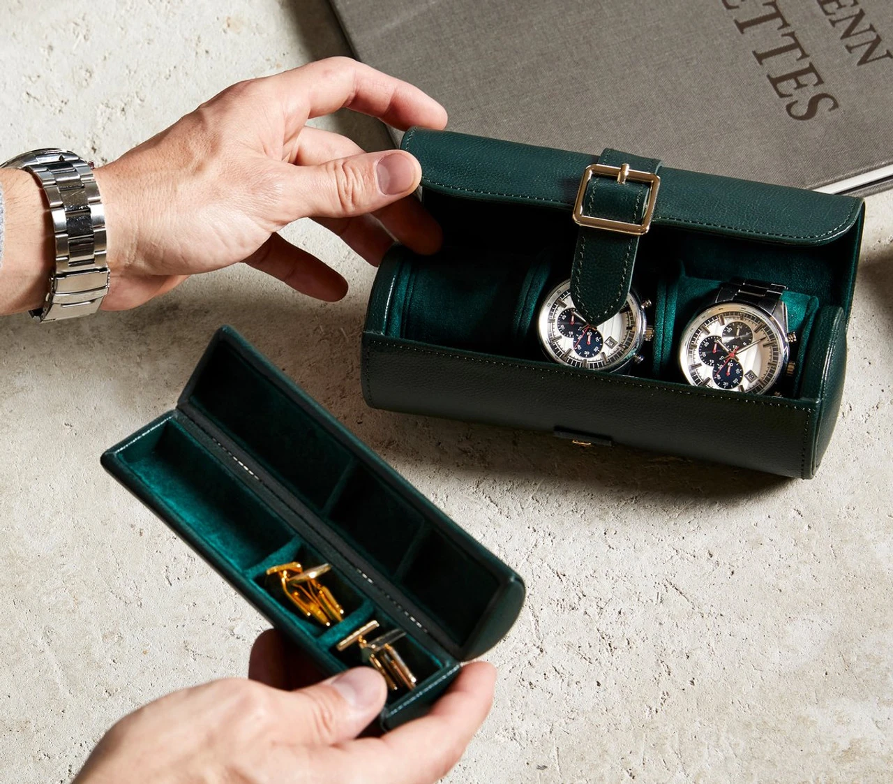 - Watch roll also includes a secret jewellery capsule (patent pending) inside the watch roll with three compartments for safekeeping of cufflinks, rings and other smaller valuables.